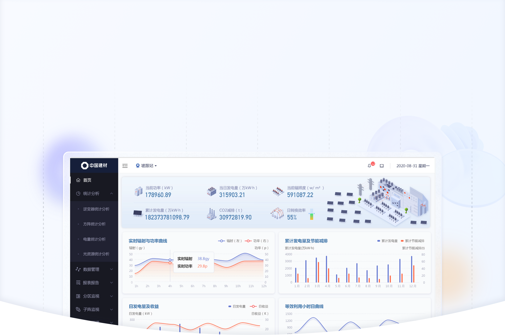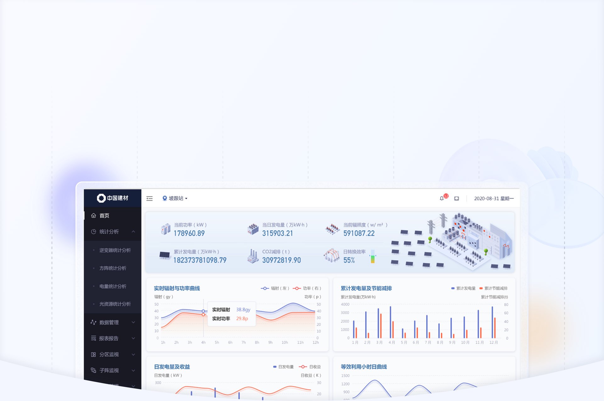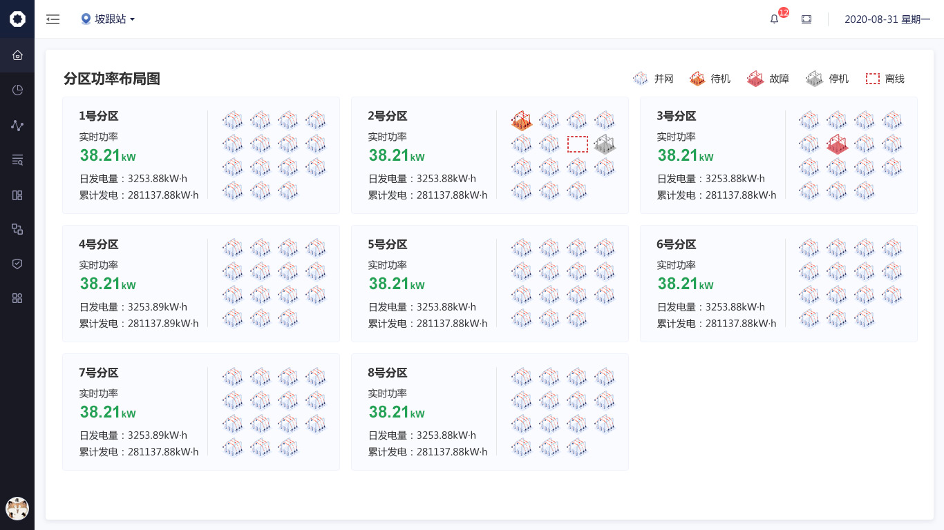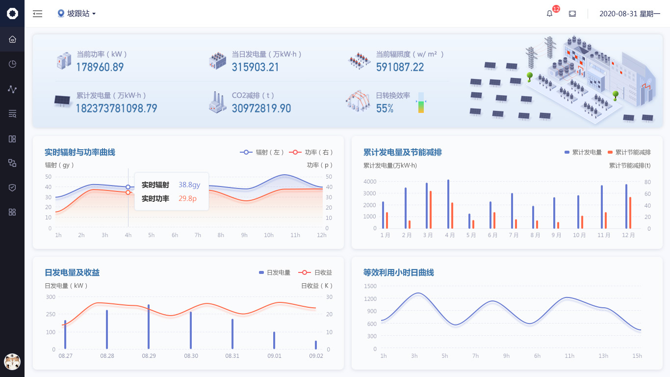 針對(duì)數(shù)據(jù)信息發(fā)生的變化,我們使用“場(chǎng)景化設(shè)計(jì)原則“,用立體圖標(biāo)方式繪制出從”光伏板-逆變器-交流匯流箱“發(fā)電原理圖,把數(shù)據(jù)展示在對(duì)應(yīng)的環(huán)節(jié)中,形成可視化的實(shí)時(shí)監(jiān)控圖譜。;其余與發(fā)電流程無(wú)關(guān)的數(shù)據(jù)也均以圖標(biāo)+文字的形式展示頁(yè)頁(yè)面右側(cè)。
