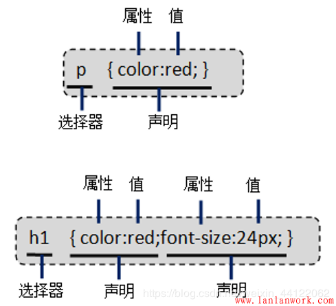 選擇器1{屬性:值;…}