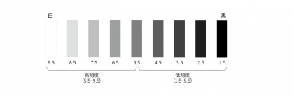 CCS 色彩體系將明度分為 17 級,每 0.5 級為一個階梯。為了方便理解,我們也可以粗略地分為 9 級,黑為 1.5,白為 9.5;以 5.5 級灰為中間點,1.5~5.5 為低明度,5.5~9.5 為高明度。明度差越大顏色對比越明顯,明度差越小則對比越弱。