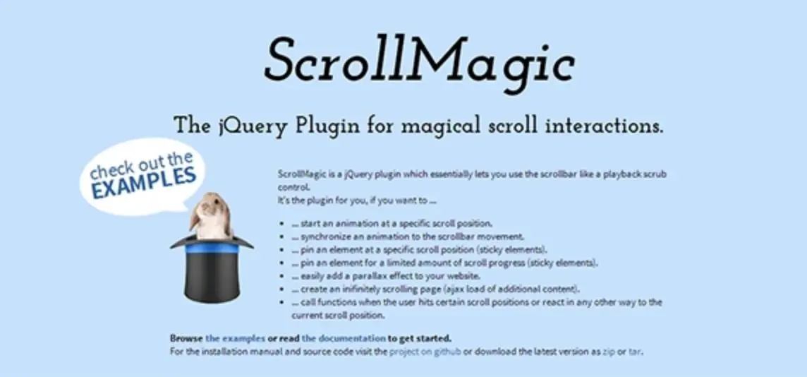 二、插件名稱(chēng):ScrollMagic 簡(jiǎn)介:ScrollMagic是一個(gè)強(qiáng)大的滾動(dòng)動(dòng)畫(huà)插件,它能夠?yàn)榫W(wǎng)頁(yè)添加各種視差效果和動(dòng)畫(huà)效果。設(shè)計(jì)師可以利用ScrollMagic創(chuàng)建吸引人的滾動(dòng)交互效果,使用戶在瀏覽頁(yè)面時(shí)獲得更好的體驗(yàn)。該插件支持多種觸發(fā)方式和動(dòng)畫(huà)選項(xiàng),具有良好的性能和可擴(kuò)展性。