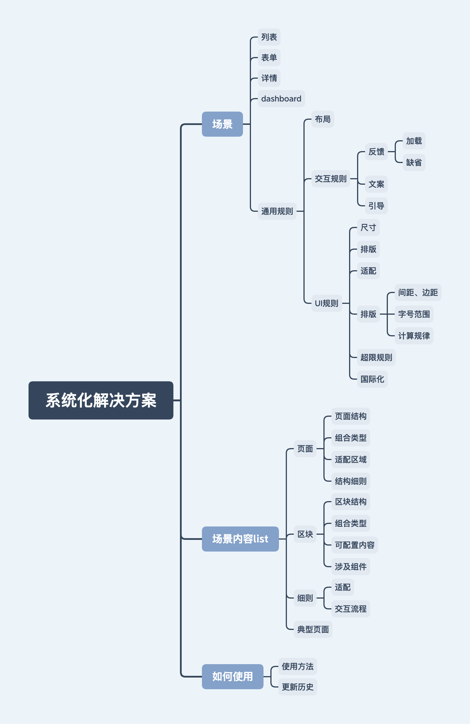 從第一步全盤的信息拆解和歸納, 已經發(fā)現(xiàn)問題, 這一階段主要2點:第一是如何通過設計規(guī)則來避免同樣的問題產生,第二是如何通過簡單的規(guī)則重組減少多人合作記憶復雜度。思路類似于設計一個界面,首先得有一個布局劃分,不同的區(qū)塊要放哪些內容,再到區(qū)塊里的細節(jié)內容規(guī)則,從而抽象出由布局到區(qū)塊的設計規(guī)則和可復用的組件。