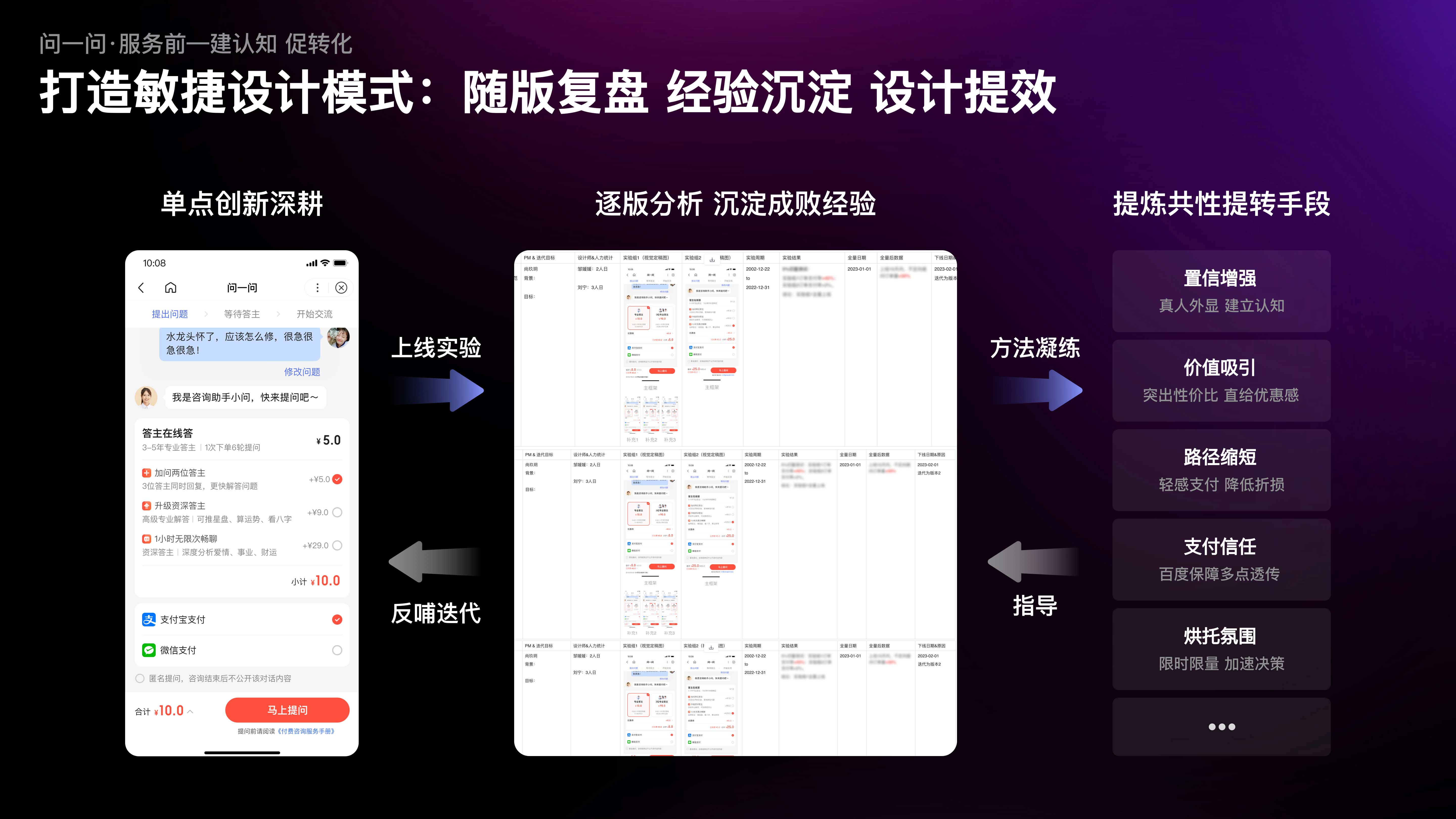 ?為了進(jìn)一步提升設(shè)計(jì)效率,我們將提問(wèn)頁(yè)的迭代歷史進(jìn)行線上化記錄,并組織團(tuán)隊(duì)定期復(fù)盤(pán)總結(jié),提煉出「真人外顯-增強(qiáng)置信感」「優(yōu)惠直給-突出性?xún)r(jià)比」「路徑縮短-弱化支付感」等一系列通用的提轉(zhuǎn)手段;又將這些手段復(fù)用到服務(wù)上下游環(huán)節(jié)的同類(lèi)場(chǎng)景中,通過(guò)系統(tǒng)化提轉(zhuǎn),有效幫助業(yè)務(wù)訂單量、GMV大幅提升。