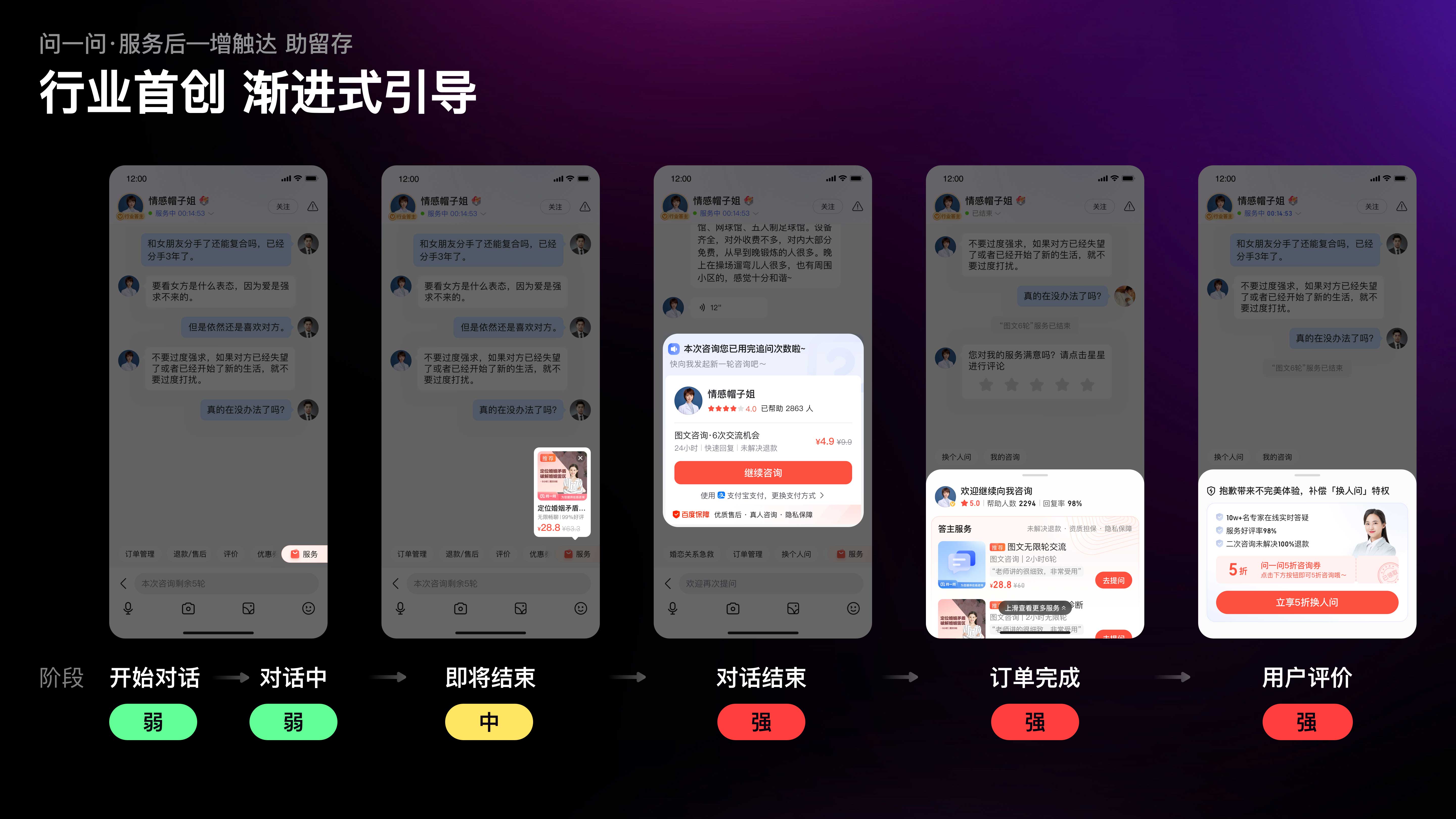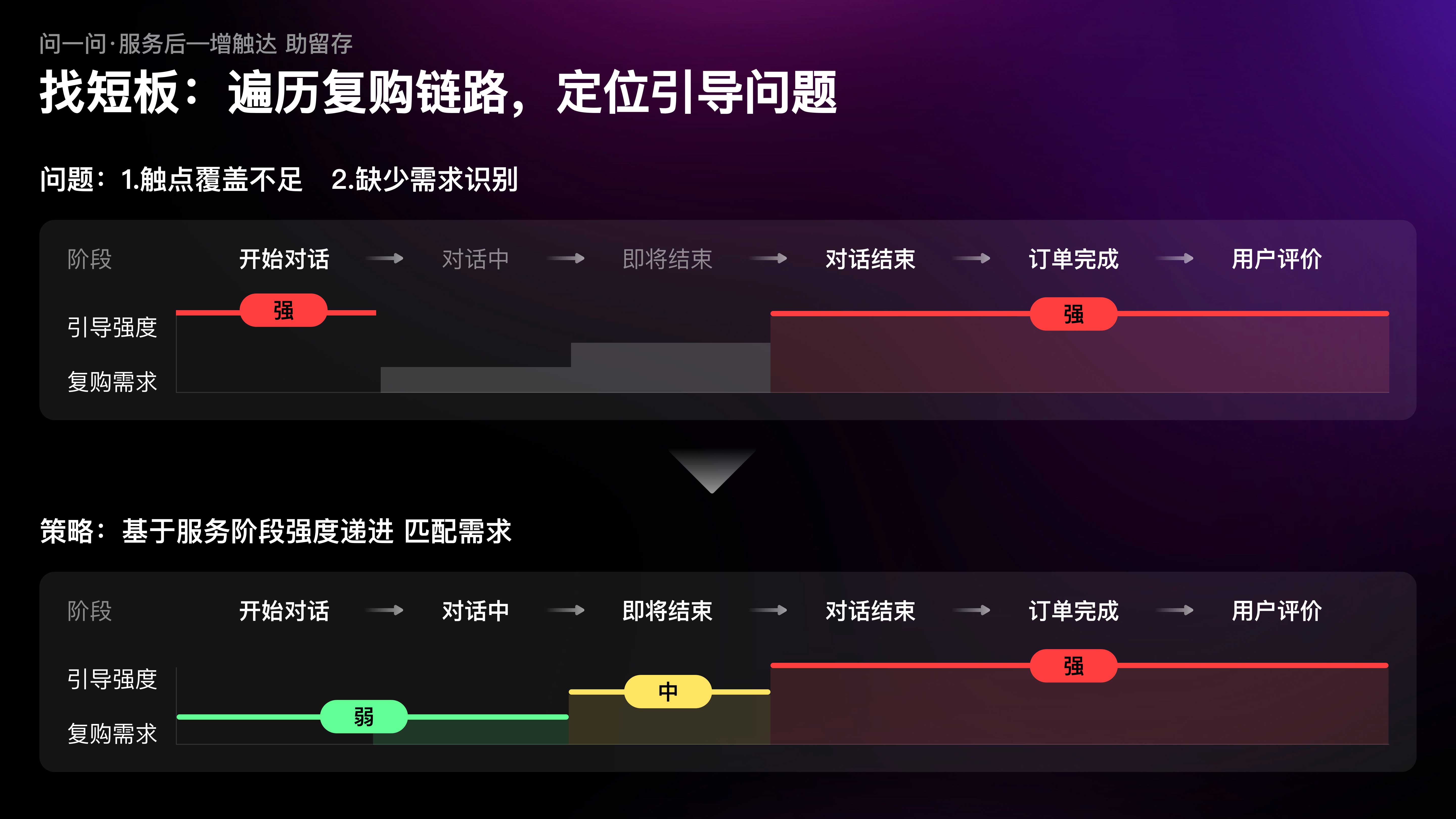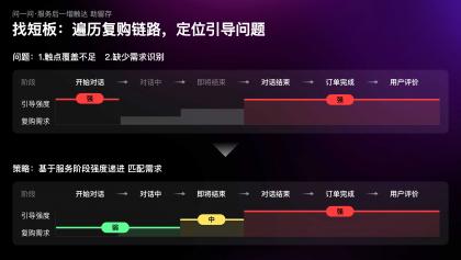 當(dāng)我們以用戶視角,遍歷咨詢(xún)鏈路中的復(fù)購(gòu)引導(dǎo)時(shí),發(fā)現(xiàn)復(fù)購(gòu)引導(dǎo)的觸點(diǎn)覆蓋不足,且缺少對(duì)特定場(chǎng)景下需求的識(shí)別,例如在咨詢(xún)開(kāi)始時(shí)復(fù)購(gòu)需求極弱,但設(shè)計(jì)引導(dǎo)極強(qiáng);而在隨后的對(duì)話過(guò)程中需求漸增,但引導(dǎo)缺失。因此,我們制定了行業(yè)首創(chuàng)的漸進(jìn)式引導(dǎo)策略;隨著服務(wù)推進(jìn),復(fù)購(gòu)需求漸增,觸達(dá)強(qiáng)度也逐級(jí)遞進(jìn)。