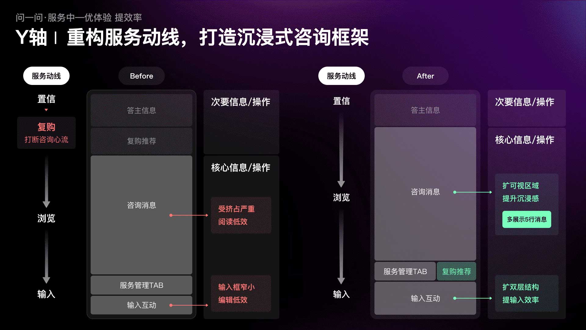 ?到了新的發(fā)展階段,我們的設(shè)計(jì)愿景該如何實(shí)現(xiàn)?問(wèn)一問(wèn)設(shè)計(jì)團(tuán)隊(duì)以“服務(wù)體驗(yàn)”為原點(diǎn),發(fā)起了C端核心服務(wù)體驗(yàn)的升級(jí)專(zhuān)項(xiàng)。借助用戶觀察、體驗(yàn)遍歷等方法,沿用戶真實(shí)體驗(yàn)路徑梳理服務(wù)“前-中-后”各階段的關(guān)鍵問(wèn)題、挖掘優(yōu)化機(jī)會(huì)。再結(jié)合設(shè)計(jì)、體驗(yàn)雙視角,建立以服務(wù)前“建認(rèn)知、促轉(zhuǎn)化”、服務(wù)中“優(yōu)體驗(yàn)、提效率”、服務(wù)后“增觸達(dá)、助留存”為核心指導(dǎo)原則的設(shè)計(jì)打法。通過(guò)切實(shí)滿足用戶在服務(wù)各階段需求來(lái)激發(fā)持續(xù)消費(fèi)、讓服務(wù)閉環(huán)順暢運(yùn)轉(zhuǎn),從而有效地賦能業(yè)務(wù)增長(zhǎng),達(dá)到體驗(yàn)和收入的雙豐收。
