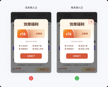 ??硕梢龅氖峭ㄟ^減少用戶做決定的時間,來提升轉(zhuǎn)化率以及用戶體驗,但不管在什么情況下,用戶都希望自己還擁有選擇的權(quán)利,如果設(shè)計師自作聰明的將選項減到只剩一個,就相當(dāng)于告知用戶必須接受,那么用戶就有種被強制、綁架的感覺,只會存在兩個結(jié)果:①被你的產(chǎn)品拿捏、②離開你的產(chǎn)品,筆者相信第一種可能性的概率極低,畢竟同類型的產(chǎn)品并不是只有你一家(壟斷除外)。如下圖的彈窗,用戶即便不愿意進入任務(wù)流程,可別無選擇,只能進入后再返回才能回到原位,這種做法無端增加用戶的操作成本,極易引起反感情緒。不管產(chǎn)品如何希望用戶轉(zhuǎn)化,切不可強制他們接受,需要給用戶留一條返回的“路”,即便不那么起眼,至少還有選擇的權(quán)利。