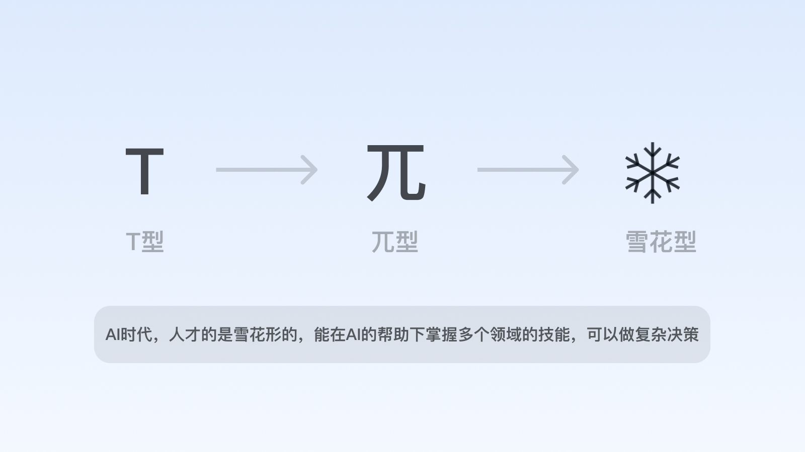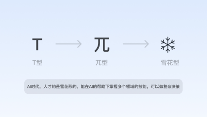 在人工智能時代,部分重復(fù)性、初級的設(shè)計需求將被替代,設(shè)計師乃至互聯(lián)網(wǎng)職場人的能力維度將隨之會有所改變,善用AI的綜合能力素養(yǎng)變?yōu)閯傂瑁谀芰S度上接近于“雪花型”。