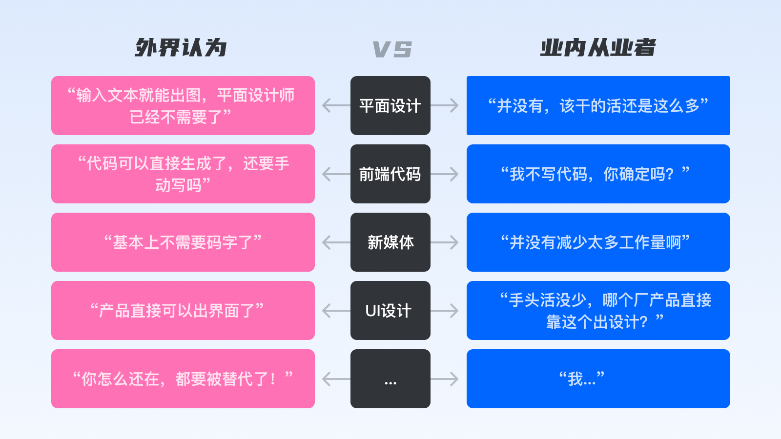有個有趣的現(xiàn)象,不管是什么崗位,外界對AI的應(yīng)用程度,總比行業(yè)從業(yè)者要“樂觀”很多,比如UI、前端崗位,感覺已經(jīng)不太需要他們參與了。