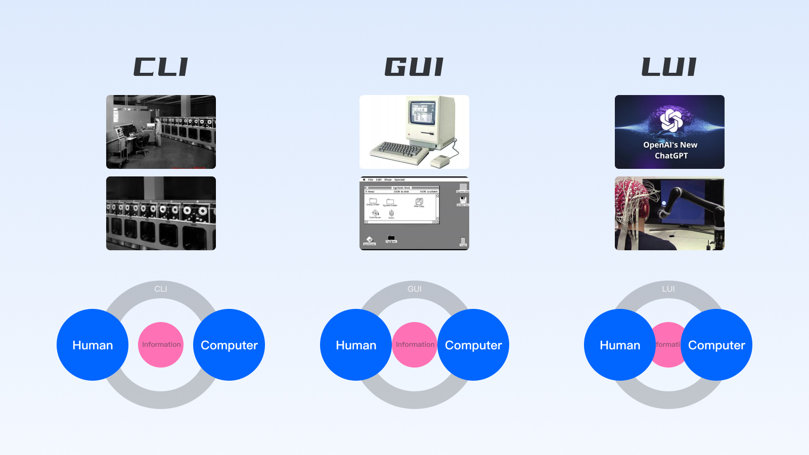 界面交互的需求繁榮得益于圖形交互的興起和市場的發(fā)展,從CLI(命令行)→GUI(圖形交互)→LUI(自然語言交互),對設(shè)計服務(wù)的要求自然不同: