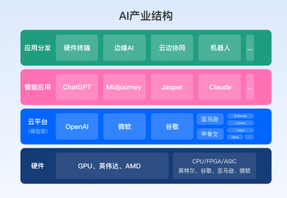 硬件、云平臺(模型層)、智能應(yīng)用、應(yīng)用分發(fā)構(gòu)成了AI整個產(chǎn)業(yè)鏈條,站在產(chǎn)業(yè)格局的角度看,算力很重要、硬件卻并非關(guān)鍵。這輪變革最大的機會在應(yīng)用層面,所以大量涌現(xiàn)出智能應(yīng)用,比如ChatGPT、Midjourney;以及各行各業(yè)基于大模型對AI能力接入,提升自己產(chǎn)品力或服務(wù)能力。