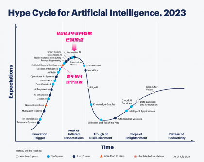 去年9月份,「Gartner」就預(yù)測生成式AI已經(jīng)進入期望膨脹高位,到2023年8月「Gartner」剛發(fā)布人工智能技術(shù)成熟度曲線,生成式AI從技術(shù)萌芽期到技術(shù)膨脹期的頂峰,跟過去一段時間AI在學(xué)術(shù)、產(chǎn)業(yè)、資本領(lǐng)域的爆火完全呼應(yīng)。