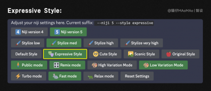 因?yàn)槭菃蝹€(gè)元素生成,背景環(huán)境關(guān)鍵詞可以省略,大家在編寫關(guān)鍵詞時(shí),注意靈活增減,不用一定按照所謂的公式來寫,藝術(shù)風(fēng)格是插畫素材,我們直接使用niji模型,其中expressive風(fēng)格會讓插畫更加富有表現(xiàn)力,可以直接在關(guān)鍵詞后面加上后綴“--style expressive ”,或者用“/settings”命令,更改設(shè)置。