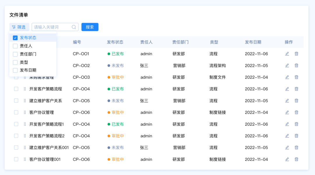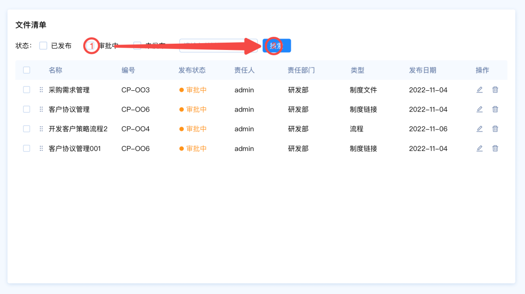 需求背景:客戶A想要快速篩選文件清單中發(fā)布狀態(tài)為“審批中”的數(shù)據(jù),希望能夠直接看到文件的狀態(tài)類型,快速選擇類型。
