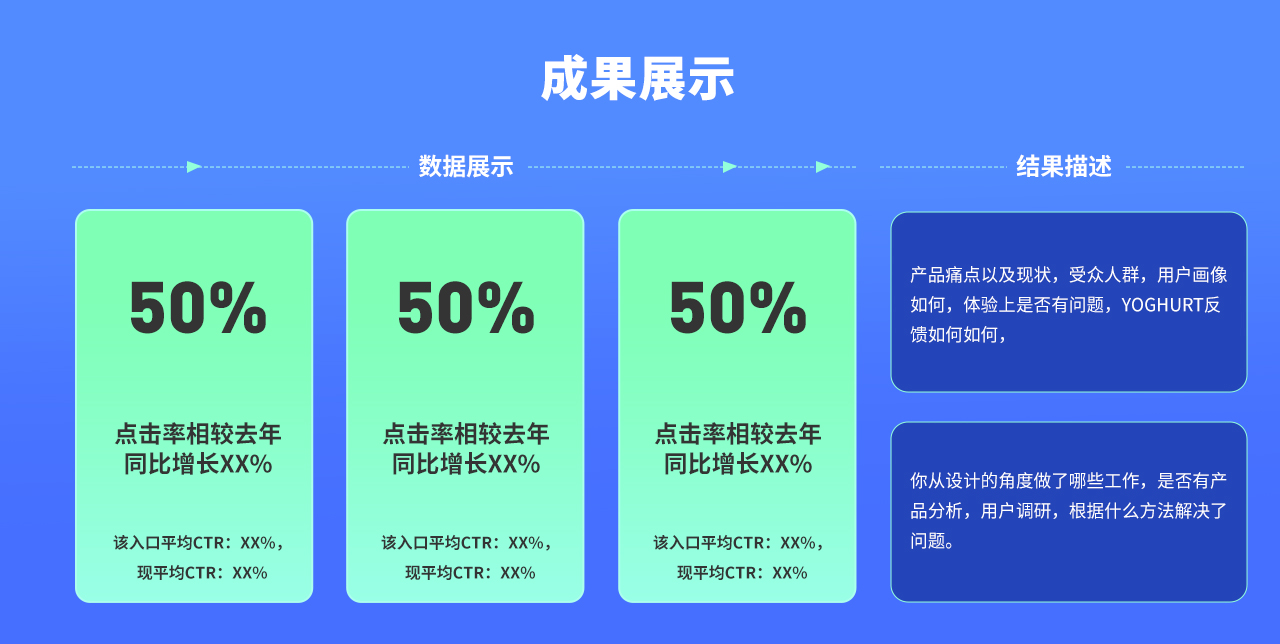 我們個(gè)人的結(jié)果,請同學(xué)們切記,數(shù)據(jù)一定要實(shí)際量化展示,因?yàn)檫@是你的個(gè)人成績,也是最直觀,最有價(jià)值的東西,不要吝嗇展示,這是晉升,就算不為了職級,也要為了薪水啊。結(jié)果這一部分,同學(xué)們可以用一頁P(yáng)PT進(jìn)行說明與展示,可以更多的留下印象。