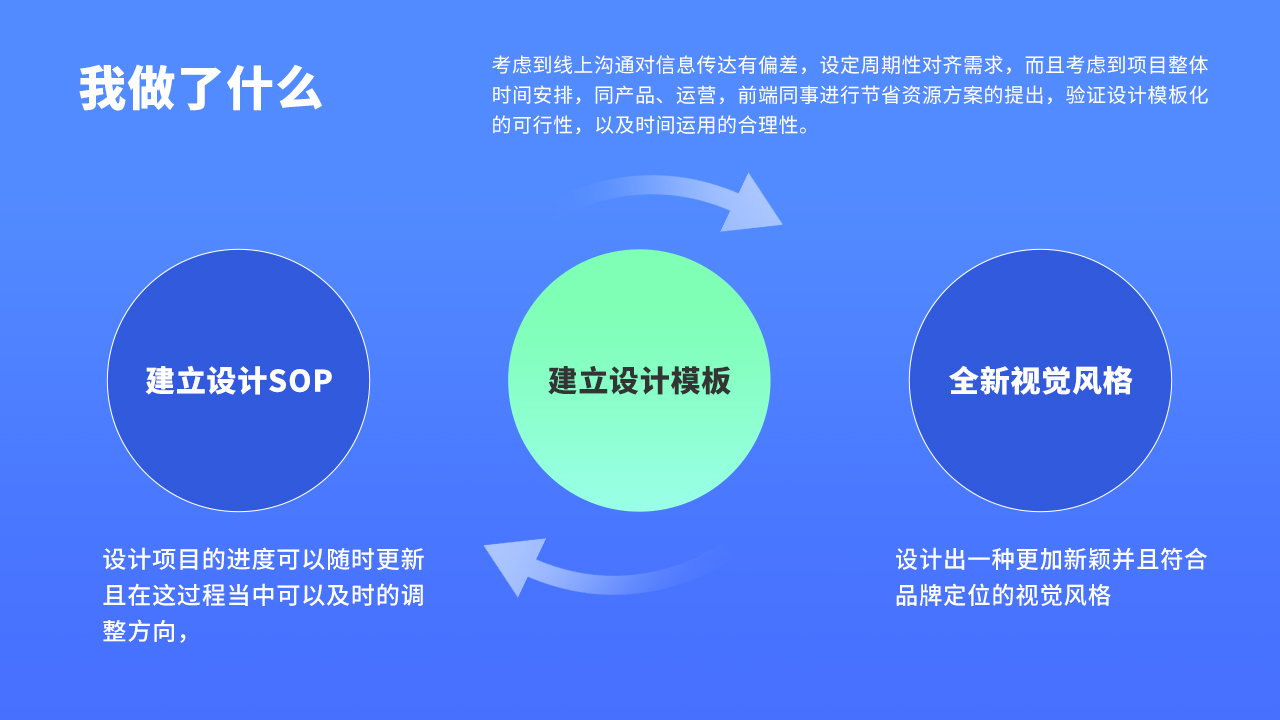 然后將直接負(fù)責(zé)人拉通對齊目標(biāo),例舉并思考每個(gè)業(yè)務(wù)板塊的優(yōu)劣勢,考慮到線上溝通對信息傳達(dá)有偏差,設(shè)定周期性對齊需求,而且考慮到項(xiàng)目整體時(shí)間安排,同產(chǎn)品、運(yùn)營,前端同事進(jìn)行節(jié)省資源方案的提出,驗(yàn)證設(shè)計(jì)模板化的可行性,以及時(shí)間運(yùn)用的合理性。