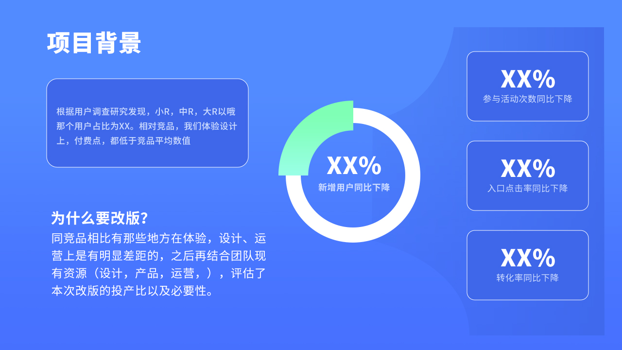這一點(diǎn)很多同學(xué)會(huì)忽略掉,從一開始就已經(jīng)犯了一個(gè)致命的錯(cuò)誤,那就是沒有項(xiàng)目背景,下面的評委不僅僅是你的leader,還有各個(gè)部門的負(fù)責(zé)人,也許針對你的項(xiàng)目,他們根本無從了解,唯一的渠道也去就是你的介紹和講解,因此這一部分是不能忽略掉的。