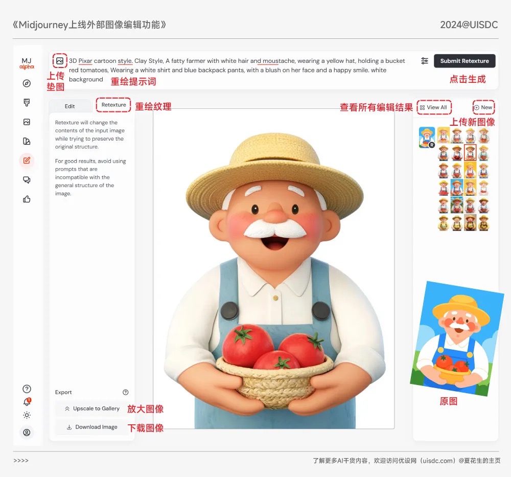 Retexture(重繪)功能:類似于Controlnet的深度控制功能,保留原始結(jié)構(gòu),根據(jù)提示詞重新繪制畫面??梢愿淖冿L(fēng)格、材質(zhì)等,如將2D插畫轉(zhuǎn)換為3D風(fēng)格。應(yīng)用場(chǎng)景包括2D轉(zhuǎn)3D、線稿轉(zhuǎn)實(shí)物圖、線稿上色等。
