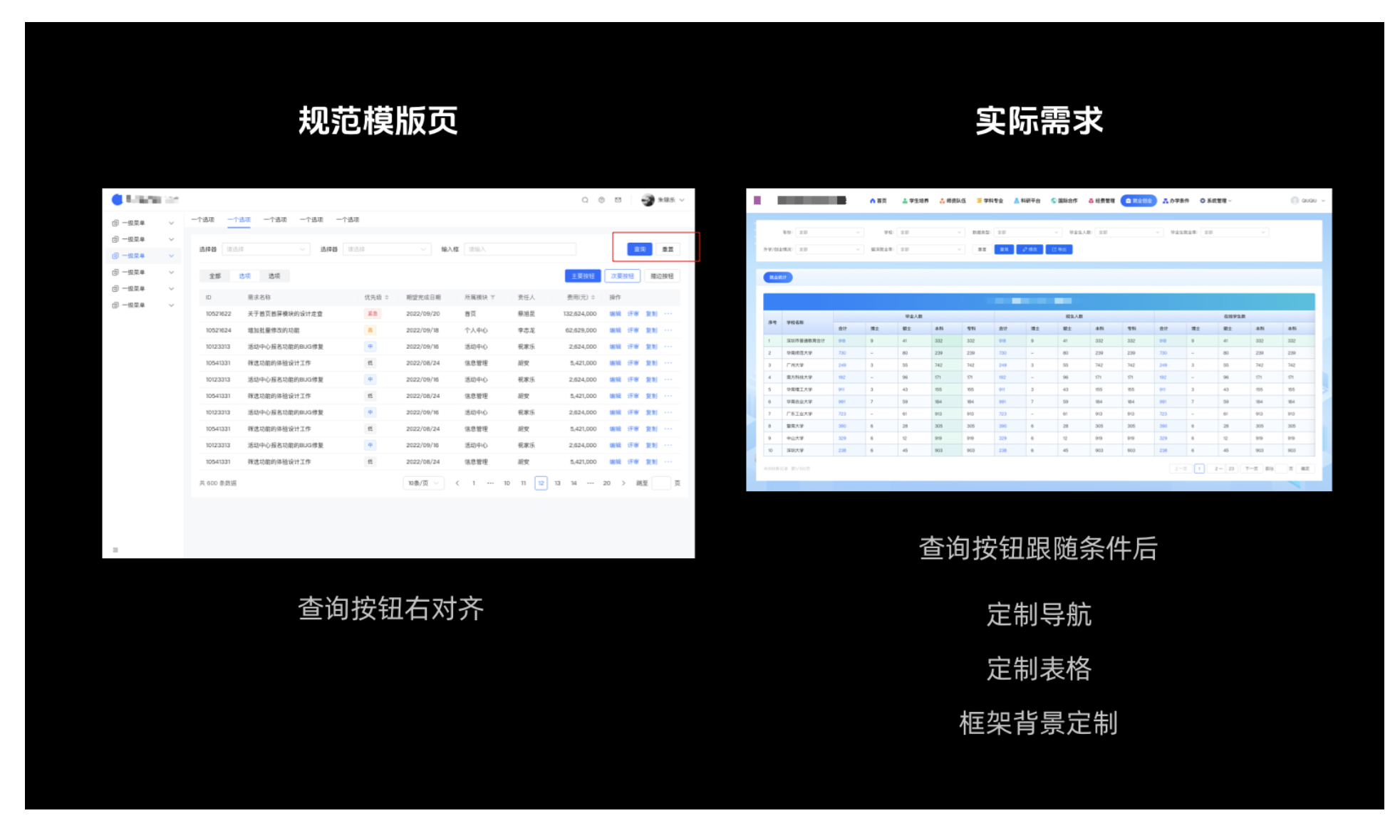 相對于彈窗,頁面的空間更大,邊界感偏弱,用戶的視覺重心更容易停留在左側(cè)表單內(nèi)容區(qū)域。所以按鈕應(yīng)該緊隨搜索條件,便于用戶快速發(fā)現(xiàn)按鈕。