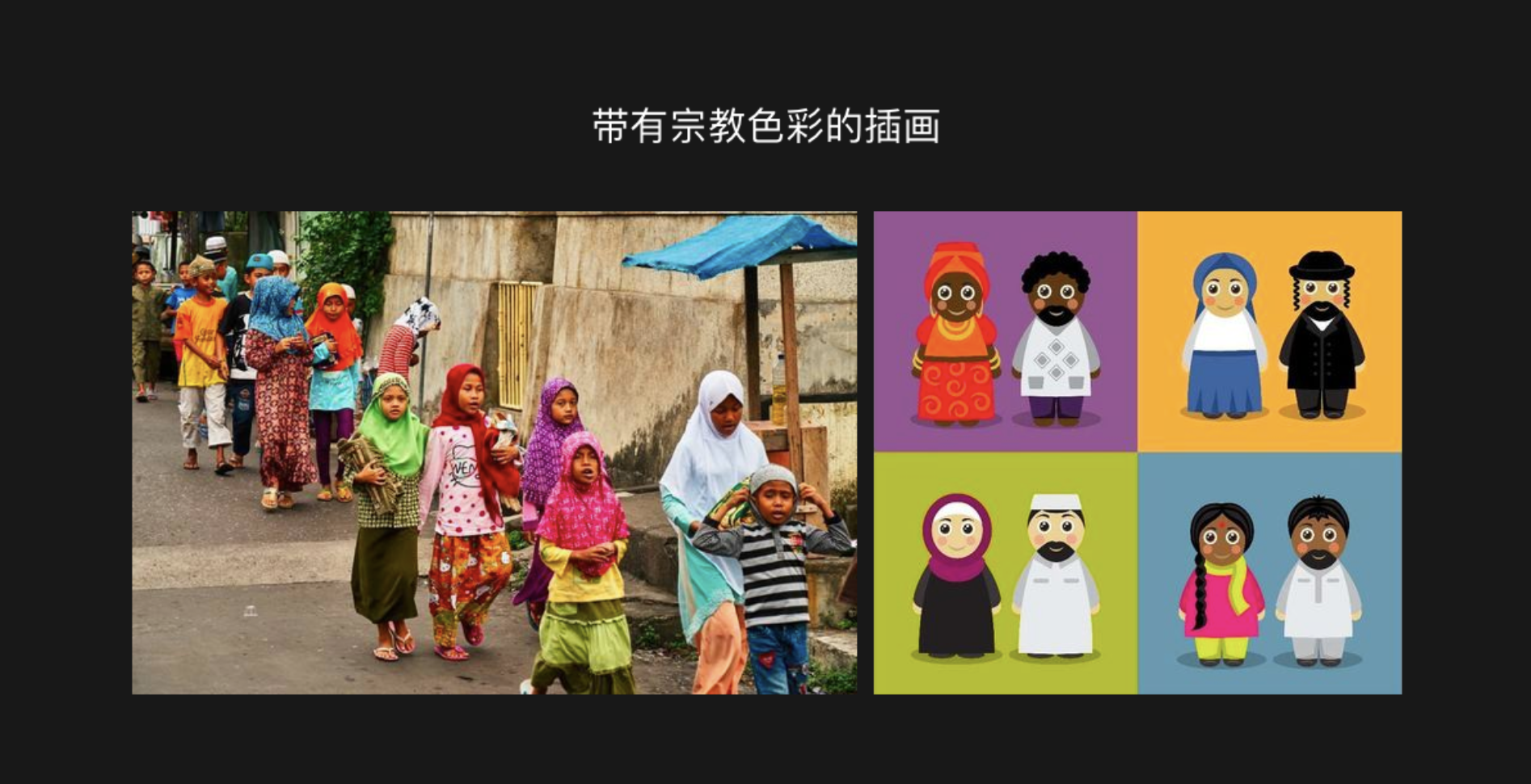 穆斯林在正式的場合,穿著要莊重得體。男性一般身穿白襯衫長褲,女性要戴頭巾,不能穿暴露的服裝。由于宗教的原因,有的女性在日常生活中也會(huì)有戴頭巾的習(xí)慣。如果在人物插畫設(shè)計(jì)中想要有比較強(qiáng)的宗教色彩,那么可以選擇融入這個(gè)元素。