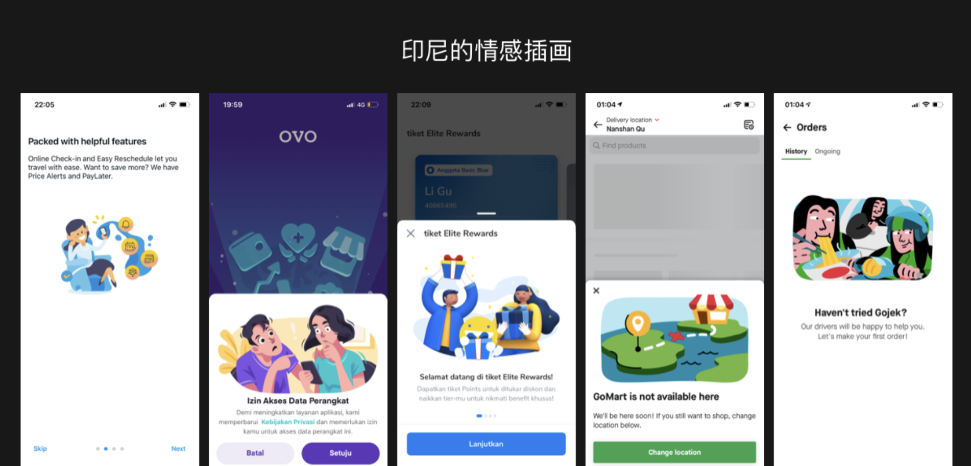 截了幾大主流 APP 的部分插畫場景,都是采用的扁平或 3D 風(fēng)格。在 hofstede 的文化維度研究中,印尼是集體主義國家,集體主義國家在創(chuàng)作上喜歡用生活常見的生活符號(hào)來傳遞深層的含義。比如下圖中的引導(dǎo)和缺省頁場景,引導(dǎo)的同時(shí)也運(yùn)用了生動(dòng)有趣的生活上的情感插畫來緩解和安撫用戶的體驗(yàn)情緒。在設(shè)計(jì)表現(xiàn)上,插畫的色彩鮮明,高飽合的色彩喚醒度較高,容易把用戶的注意力轉(zhuǎn)移到畫面上來,且插畫都是圍繞一個(gè)故事性的場景來開展,具有很強(qiáng)的觀賞性,從而打造了良好的用戶體驗(yàn)流程。