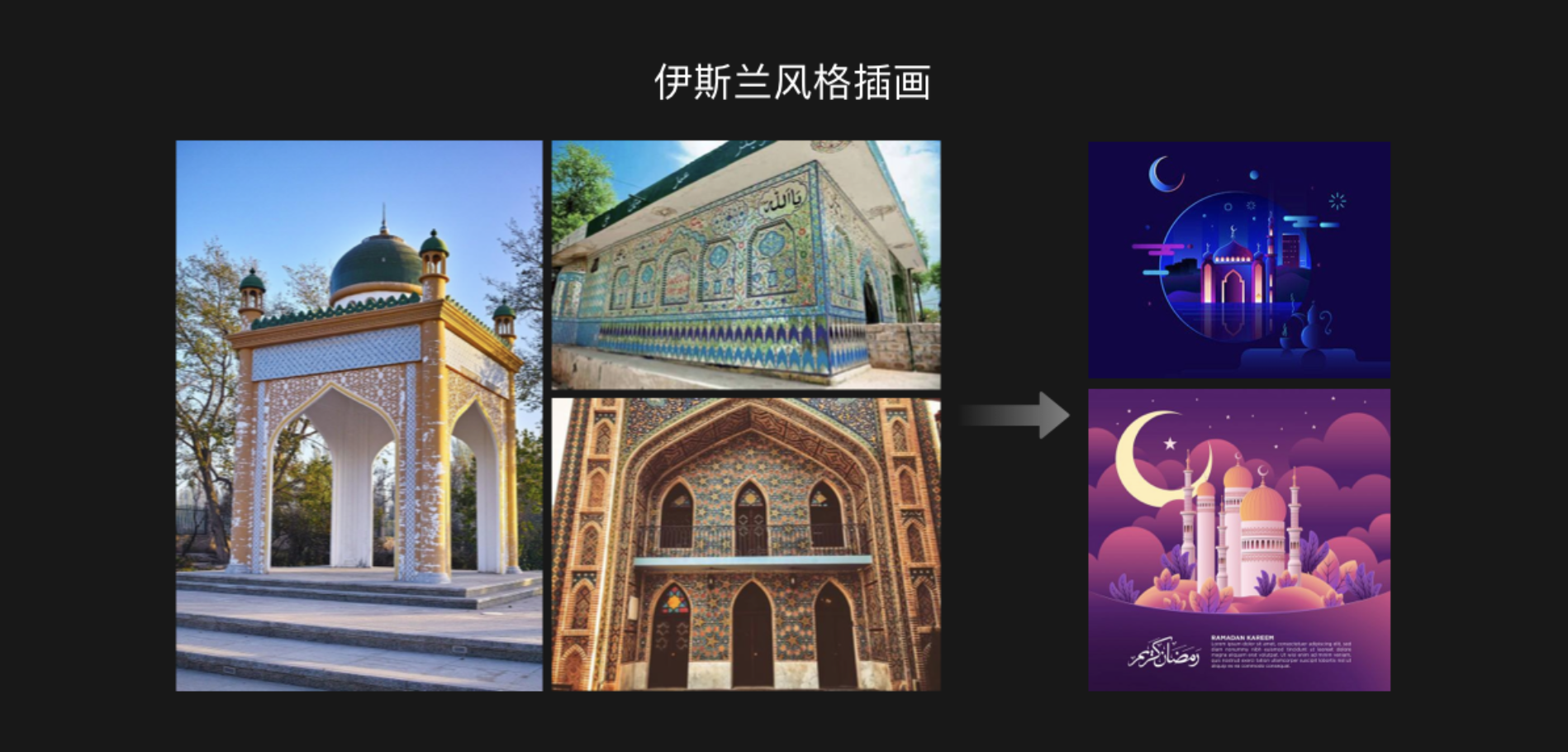 如果是想要?jiǎng)?chuàng)作較強(qiáng)的宗教色彩的風(fēng)格插畫,可以嘗試融入伊斯蘭文化的藝術(shù)。如下圖中插畫中,在造型上就提煉了穹頂、拱門、尖塔的形狀。伊斯蘭藝術(shù)中主要的裝飾物是幾何紋理、植物紋理和文字紋理,紋理之間均衡、對(duì)稱、有節(jié)奏感。在色彩上也可以使用藍(lán)綠色,藍(lán)綠色在伊斯蘭藝術(shù)中占有重要地位。裝飾紋理再加上藍(lán)綠色,形成了獨(dú)特的伊斯蘭教風(fēng)格藝術(shù)。