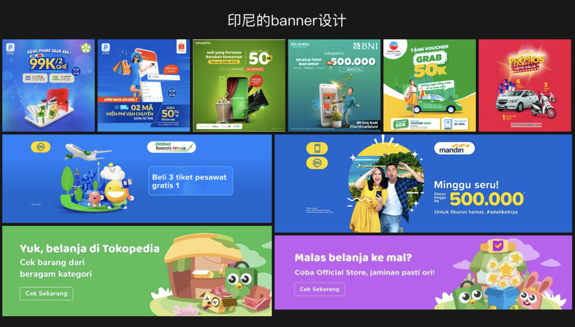 下圖是印尼本土的 banner 風(fēng)格,local 的設(shè)計(jì)偏愛使用濃重的色彩,且純度大于明度。背景大部分是采用純色,沒有過多的氛圍裝飾。運(yùn)用高飽合度色彩的前進(jìn)感,使主體從背景中突出