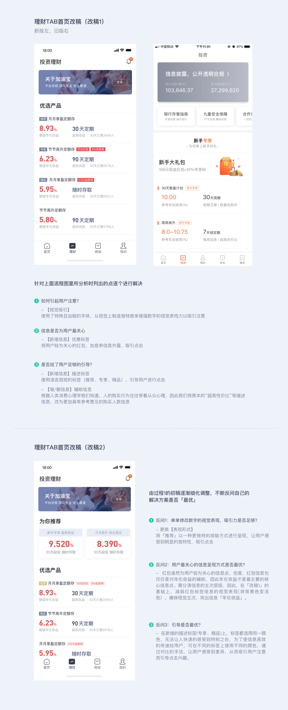 - 6.0 改版措施:將收益數字從 “7.00%” 改為 “9.520%” 并加粗,添加 “新手專享 188 元紅包 + 10% 專享標” 等信息,增加「推薦」「精品」標簽。