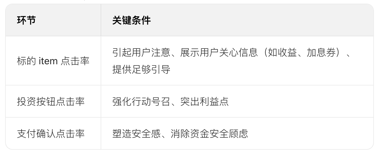 - 提升投資按鈕點擊率:優(yōu)化按鈕文案(如 “立即投資” 突出行動),強化利益描述(如 “預期收益 34.52 元 + 12.33 元已加息”)。