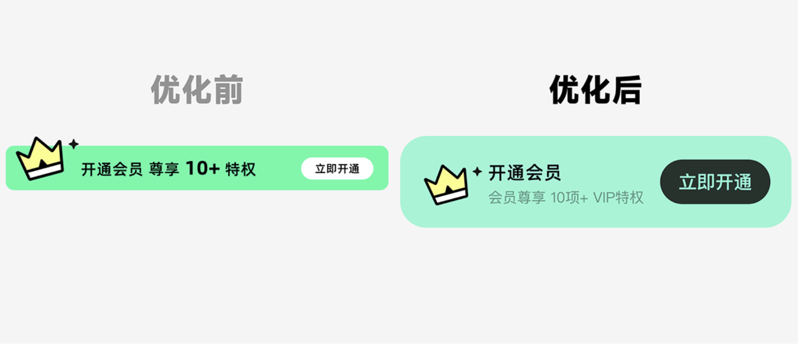 之前的 “開通會員” 入口,就一句話 “開通會員 尊享 10 + 特權(quán)” 加個小按鈕,平平無奇。優(yōu)化時我們分了三步 “造層次”: