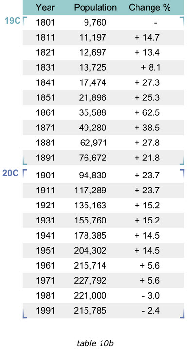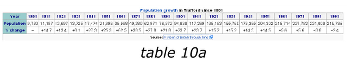 當(dāng)我們?cè)谧珜憌ikipedia上的Trafford條目時(shí),有一個(gè)1801至1991年的人口變化表格10a,他包含有2行20列,讀者必須記住有關(guān)信息,并且不停的對(duì)照表頭和數(shù)值來確認(rèn)他們的關(guān)系,否則他們就無(wú)法獲得趨勢(shì)信息。