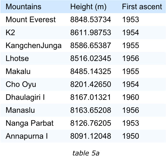 例如:找到最接近8500米的山峰,第二章表格要遠(yuǎn)比第一個(gè)表格容易。山的高度到毫米顯然沒有必要,他使得讀者誤認(rèn)為這些數(shù)據(jù)的確是經(jīng)過精準(zhǔn)測(cè)量,然而事實(shí)有可能不是這樣。根據(jù)讀者的需要提供數(shù)據(jù)的準(zhǔn)確程度,并不會(huì)削弱數(shù)據(jù)的有效性。當(dāng)然又少部分人會(huì)質(zhì)疑第二章表格的準(zhǔn)確性,但是大部分人會(huì)想山峰的高度能夠被測(cè)量的如此嗎?(山峰每年移動(dòng)的距離就遠(yuǎn)不止于此),甚至還會(huì)對(duì)從整體上對(duì)數(shù)據(jù)的有效性以及及時(shí)性提出質(zhì)疑。