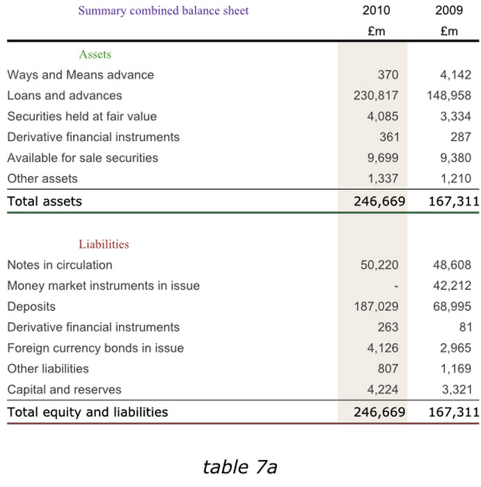在英格蘭銀行2010年度報(bào)告中,盡管我們不能通過改變數(shù)據(jù)來達(dá)到讀者的期望,但是在其他同樣的報(bào)告中,我們?cè)谀┪苍黾右涣杏杏玫臄?shù)據(jù),以避免用戶在比較各年度數(shù)據(jù)的時(shí)候,還需要自行計(jì)算增長(zhǎng)或減少的幅度。下面第一個(gè)表格6a已經(jīng)增加了總資產(chǎn)和總負(fù)債數(shù)據(jù),而表格6b則在右側(cè)增加了新的一列,使我們更容易分析出哪些領(lǐng)域的經(jīng)營(yíng)成果發(fā)生了實(shí)質(zhì)性變動(dòng)。
