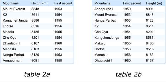 表格中的項(xiàng)目應(yīng)該通過某種排序的手段來滿足閱讀者的興趣。我們來看下面的兩個(gè)表格,左面的展示了世界上最高的十座山峰,鑒于“高度”最受關(guān)注,那么表格的項(xiàng)目就是按照這個(gè)字段降序排列的。這樣最受關(guān)注的信息能夠排在表格的最前面。