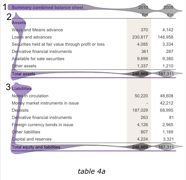 下面的英格蘭銀行2010年年報(bào)的一組信息被分成了兩個(gè)表格,但仍然體現(xiàn)為一個(gè)整體。紫色的表頭清晰的給出了標(biāo)題,標(biāo)題行僅用了一次表頭(2009、2010)和單位(英鎊)。兩個(gè)表格采用同種顏色加粗的字體作為標(biāo)題,清晰而相互獨(dú)立。兩表各自的最后一行也采用了同樣顏色的下劃線。