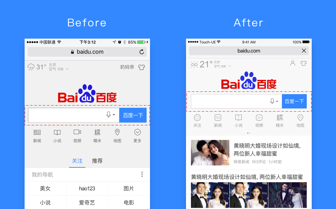 百度三端首頁每天數(shù)億人使用,作為設計團隊我們經(jīng)過不斷實踐和反思,提煉整合確立了自己的設計觀,通過以下一些案例分享其中一些經(jīng)驗,希望以此作為設計師工作思考的模板與參考。