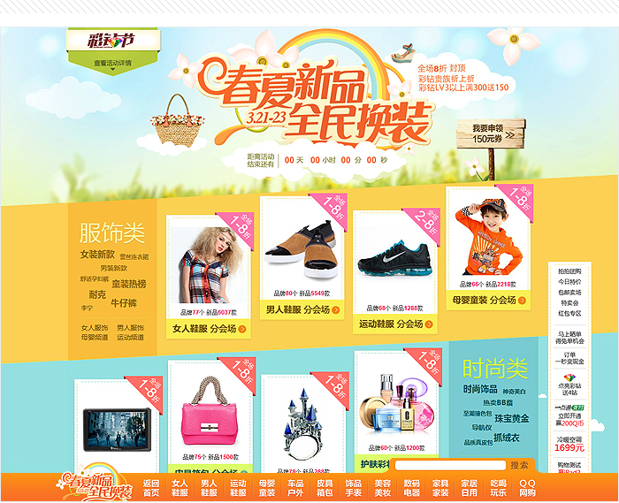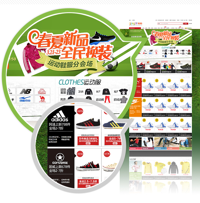 拍拍3月的大型促銷(xiāo)活動(dòng)《春夏新品,全民換裝》,主會(huì)場(chǎng)設(shè)計(jì)上運(yùn)用明快、鮮艷的春夏色彩塊組合,在細(xì)節(jié)上采用花朵草地藍(lán)天更加突顯初春購(gòu)物的輕松氛圍。并在活動(dòng)頭部主畫(huà)面中采用HTML5+CSS3實(shí)現(xiàn)的酷炫動(dòng)畫(huà),為用戶帶來(lái)了全新的頁(yè)面體驗(yàn)。