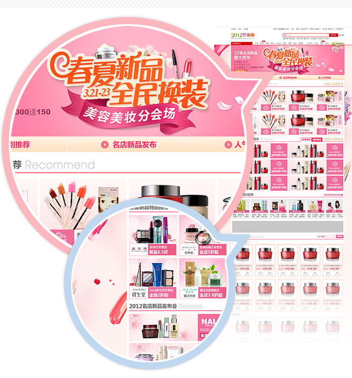 3月促化妝品分會(huì)場(chǎng)運(yùn)用粉紅色為主色調(diào),更容易讓人聯(lián)想到粉嫩的肌膚和絢麗的彩妝。大背景使用護(hù)膚品和彩妝用品的特寫(xiě)展現(xiàn)美容用品的美感,烘托賣(mài)場(chǎng)氛圍。