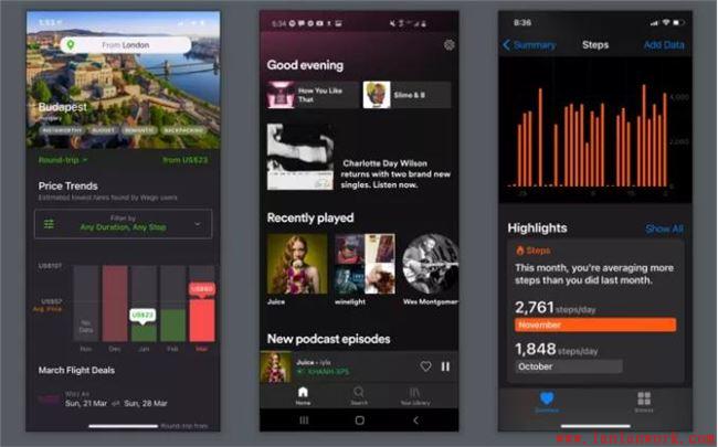 Wego、Spotify和蘋果的手機(jī)應(yīng)用在暗黑UI設(shè)計(jì)上做得很好。這些手機(jī)應(yīng)用遵循深色UI設(shè)計(jì)的原則,即只在邊框上使用純正的黑色,在不同的標(biāo)高水平上使用適當(dāng)?shù)年幱霸?,以及有限的?qiáng)調(diào)色。