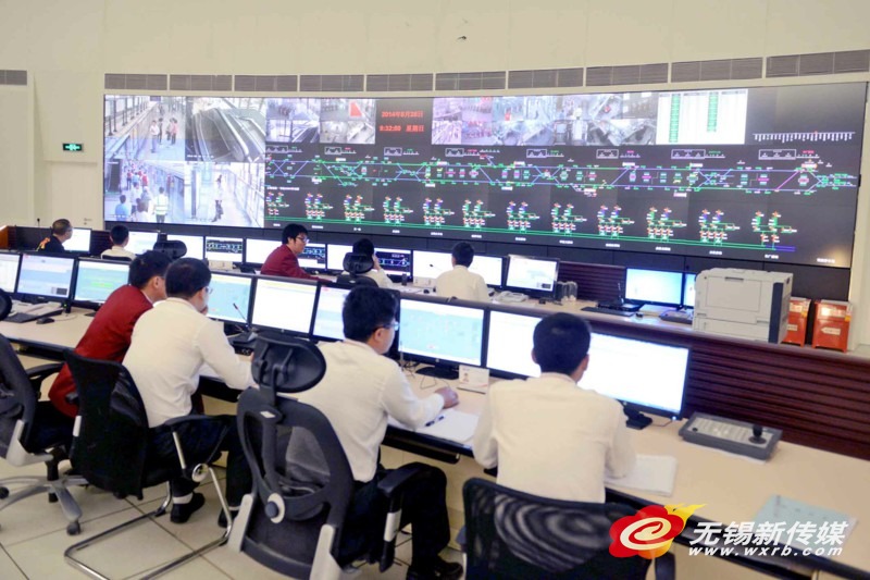 相關(guān)負(fù)責(zé)人介紹,大屏幕最上方一個(gè)個(gè)顯示著列車、車站景象的小窗口是1號(hào)線各個(gè)站點(diǎn)的實(shí)時(shí)監(jiān)控圖像,可以清晰看見地鐵內(nèi)發(fā)生的情況。下面有著紫色綠色條紋的一幅幅圖像就是地鐵的信號(hào)系統(tǒng),哪輛車行到哪里,間隔多少,是否有情況需要停車……這里一目了然,調(diào)度人員就是在同步的電腦屏幕上進(jìn)行調(diào)度,保證地鐵正常運(yùn)營(yíng)。最下面的是供電系統(tǒng),停電、變電、送電等操作都在這上面完成。