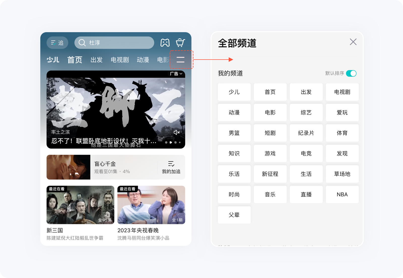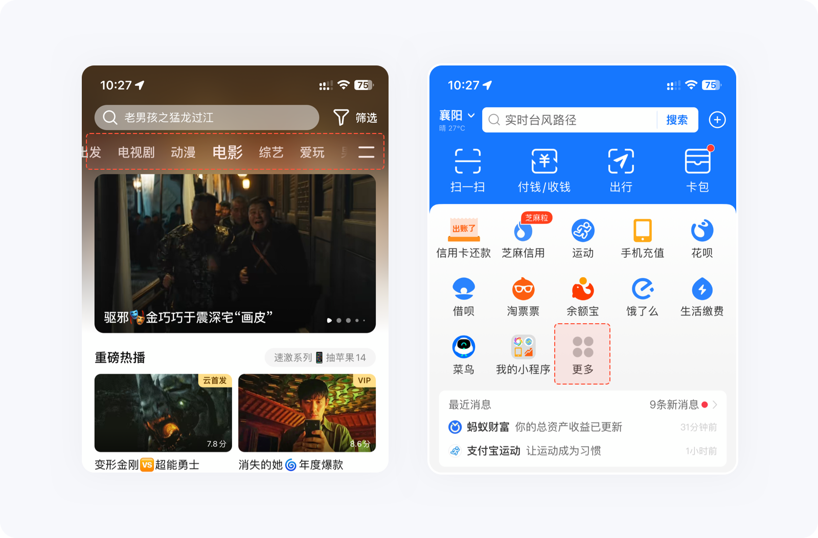 如果大量的選項(xiàng)無法減少,可將重要選項(xiàng)靠前,將其他的隱藏起來,方便用戶決策及降低失誤操作的概率。例如騰訊視頻頂部分類后面的更多圖標(biāo)、支付寶首頁(yè)金剛區(qū)的更多入口,點(diǎn)開后就會(huì)發(fā)現(xiàn),里面隱藏了非常多的功能,這樣做能減少用戶認(rèn)知負(fù)荷,提高信息篩選的效率。