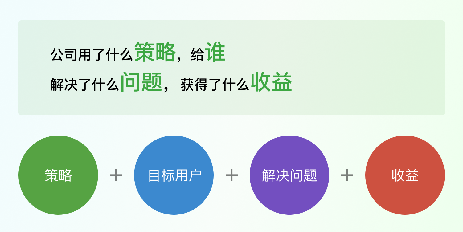 到此先做個(gè)小結(jié):① 了解公司盈利和運(yùn)作的公式:公司用了什么策略,給誰(shuí),解決了什么問題,獲得了什么收益