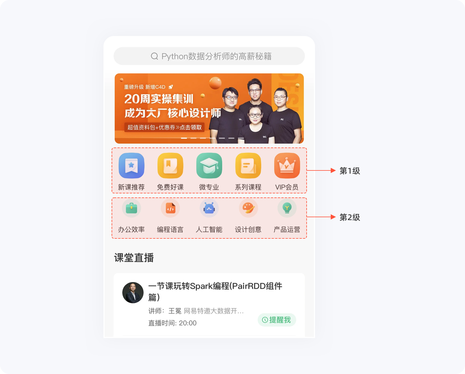 分類是希克定律中很好的一種表達(dá)方式,雖然選項(xiàng)并沒有實(shí)質(zhì)性的減少,但用戶可通過分類避開了很多不必要的選項(xiàng),不管是通過父子及級(jí)還是平級(jí),都做到了將大量選項(xiàng)明確區(qū)分,用戶需要深挖時(shí)總會(huì)有跡可循。Giles Colborne 說過“不要用過于專業(yè)的標(biāo)準(zhǔn)進(jìn)行分類”,用通俗易懂的組織方式更是促進(jìn)??硕杉涌煊脩魶Q策效率的一種有效方式。