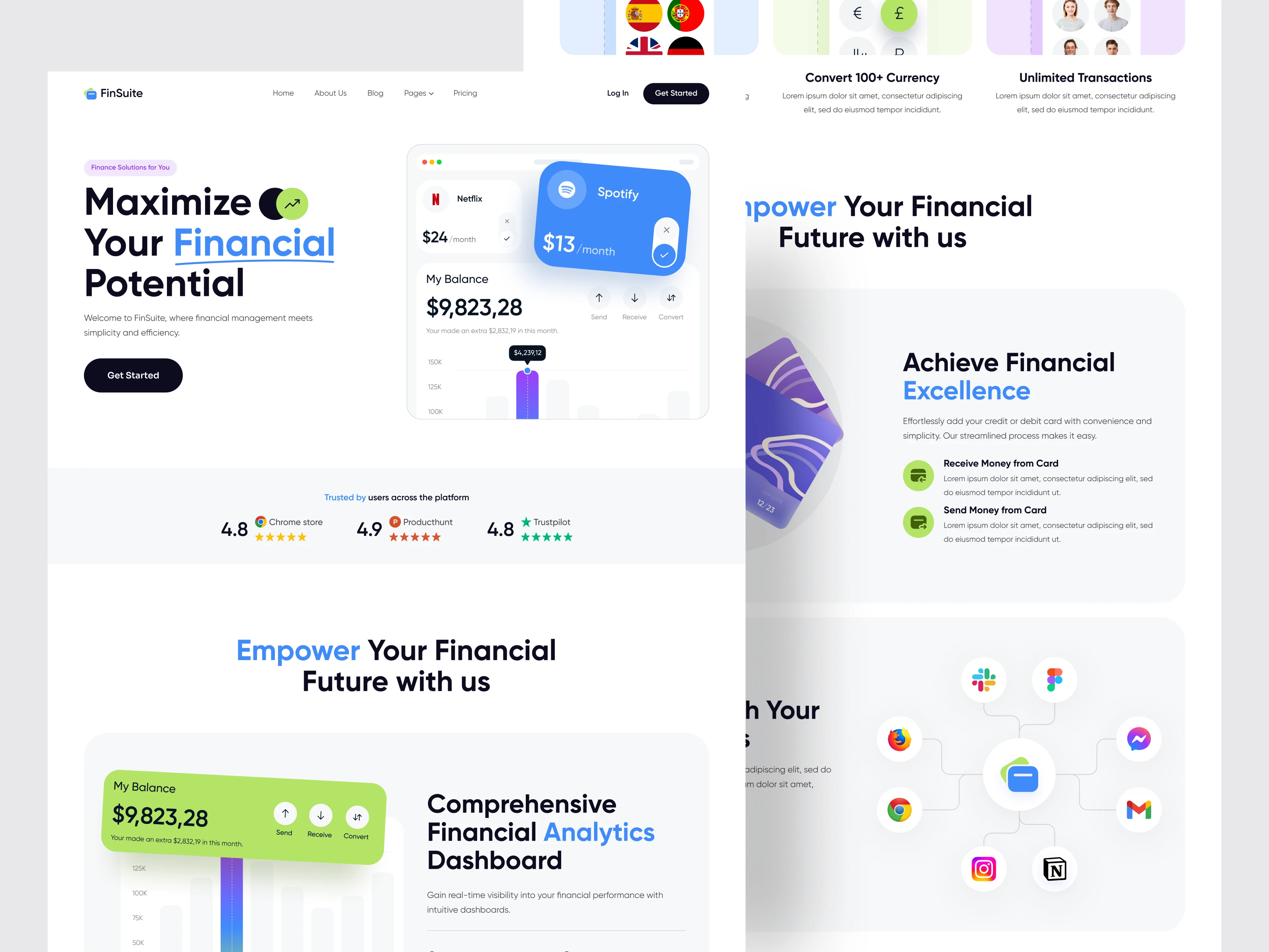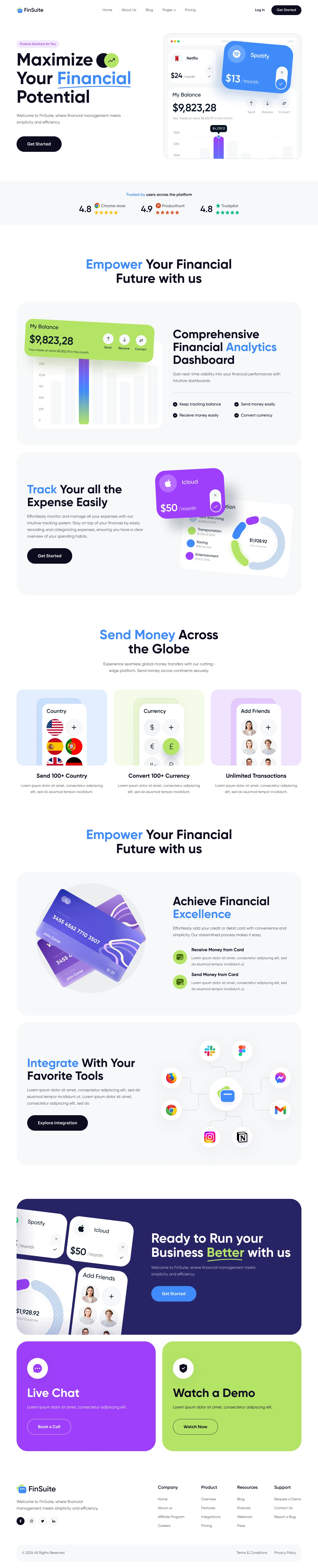 1.   Hero 區(qū):大標(biāo)題 + 產(chǎn)品截圖 → 直接傳達(dá)核心價(jià)值(Maximize your financial potential)。