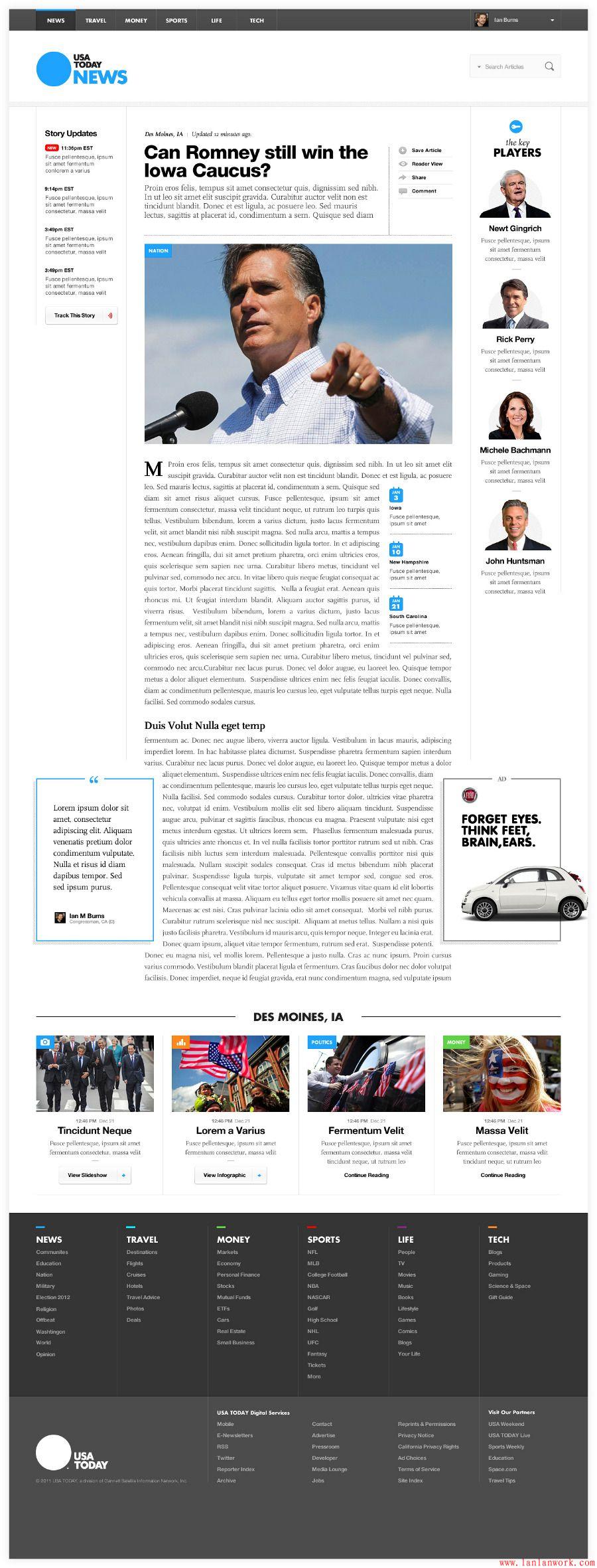 新聞類的網(wǎng)站就是以內(nèi)容為主的,因此我們要把重點放在文章的內(nèi)容上。醒目的標題最能引起用戶的注意,因此要把新聞標題設置的醒目而且放在最顯眼的位置。文章的內(nèi)容要求精、簡,提取新聞的精華簡單的提供主要的信息。精簡用戶閱讀的內(nèi)容的時間,讓用戶關(guān)注網(wǎng)站上更多的其他內(nèi)容,延長用戶停留在網(wǎng)站上的時間。最后我們來看內(nèi)容的時效性。新聞的時效性尤其重要,大家都喜歡了解最新的新聞動態(tài),因此及時的更新網(wǎng)站,及時的提供最新的新聞,讓更多的用戶看過來!