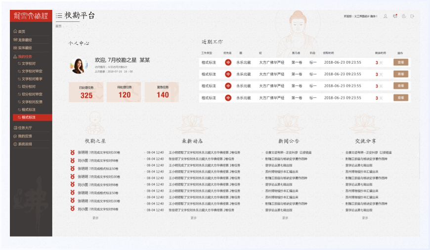 其他內(nèi)容包括“校勘之星”“最新動態(tài)”“新聞公告”“交流分享”,四部分共同放置在頁面下方,且橫向水平等距分布,在視覺上更加和諧。